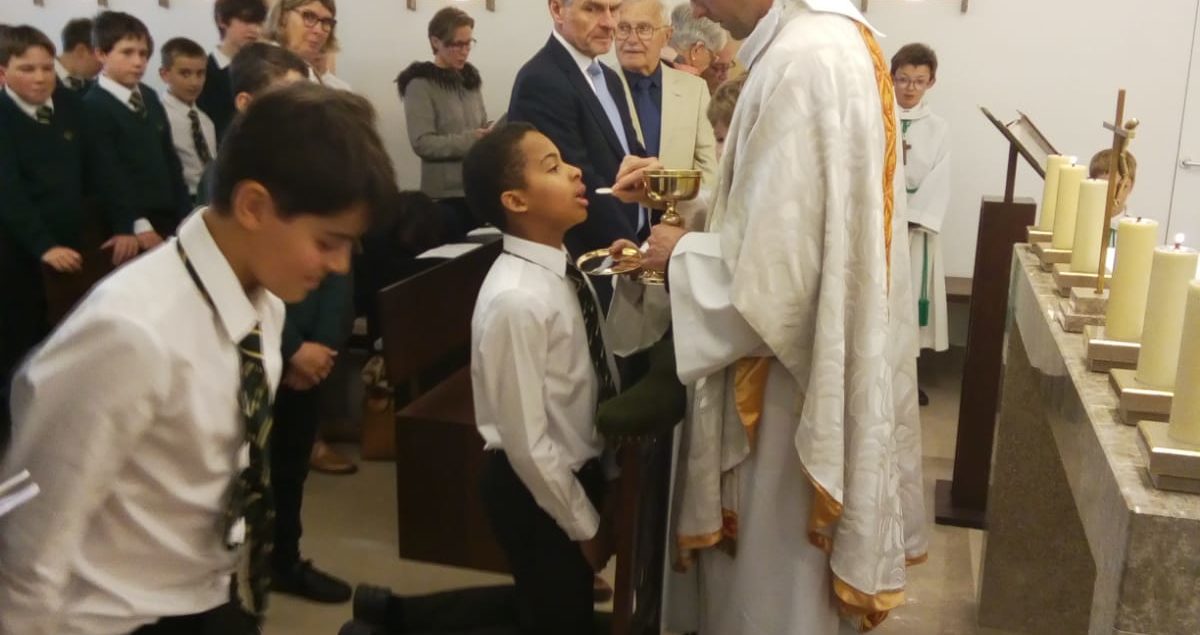 Le 30 avril, trois élèves de Sixième communiaient pour la première fois. Ce beau moment, célébré au cours de la messe des Sixièmes, a été longuement préparé avec leur aumônier, l’abbé Laffon. Parents et grands-parents étaient présents, et les trois Premiers Communiants ont ensuite partagé un déjeuner de fête à l’extérieur, avec leurs familles respectives.