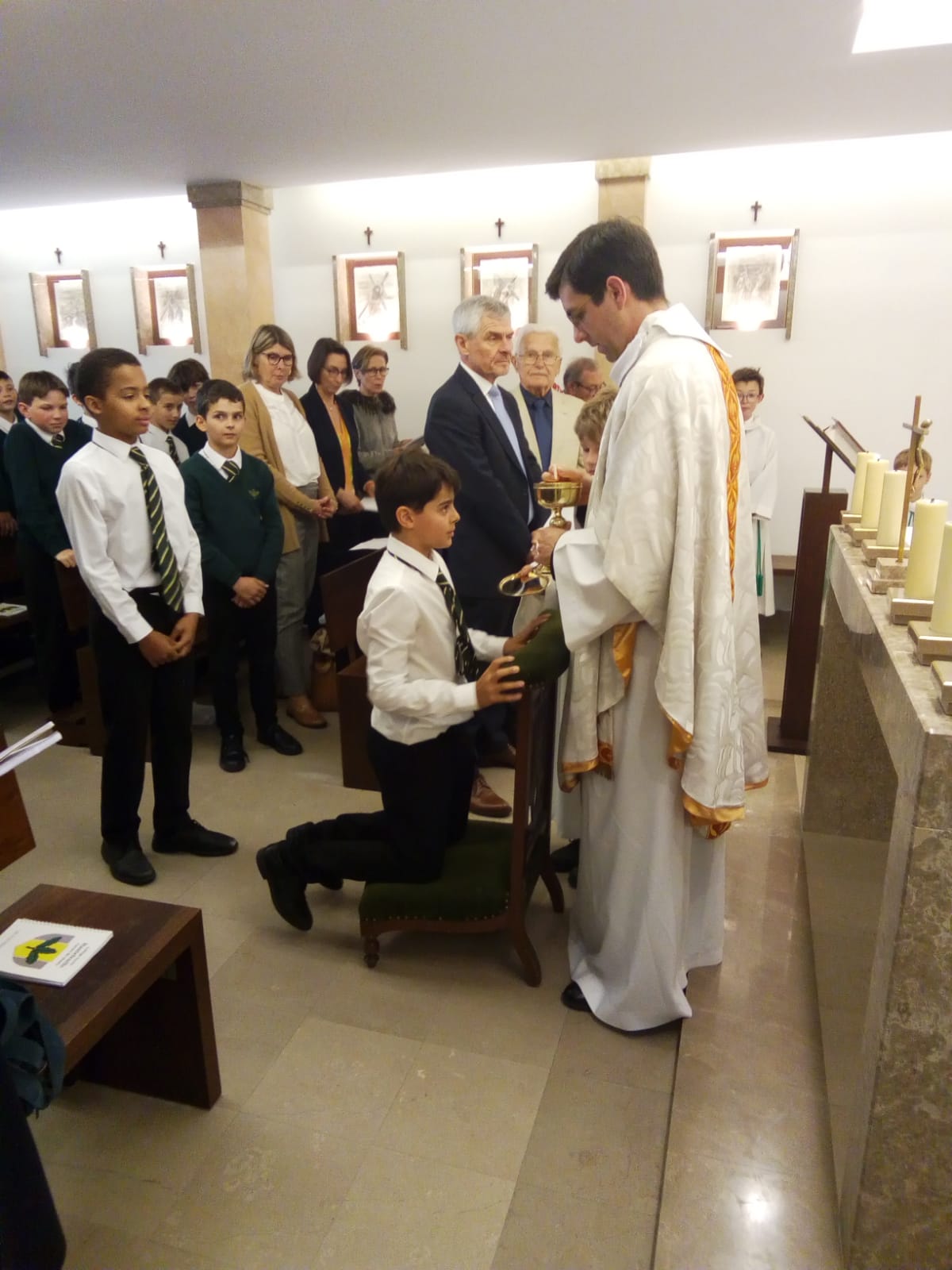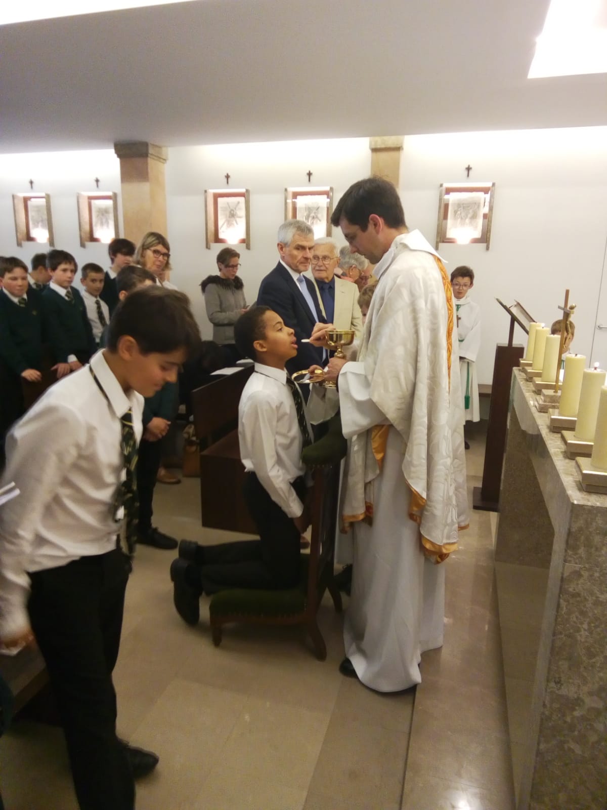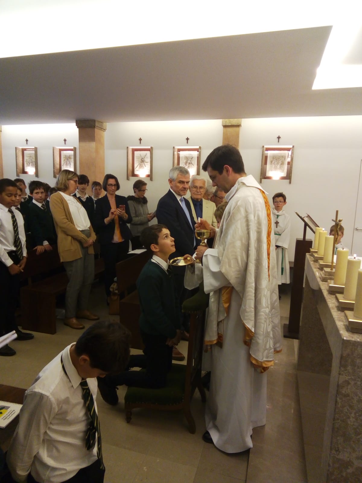 Le 30 avril, trois élèves de Sixième communiaient pour la première fois. Ce beau moment, célébré au cours de la messe des Sixièmes, a été longuement préparé avec leur aumônier, l’abbé Laffon. Parents et grands-parents étaient présents, et les trois Premiers Communiants ont ensuite partagé un déjeuner de fête à l’extérieur, avec leurs familles respectives.